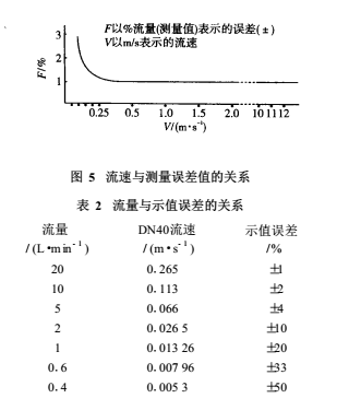 由EMF的測量原理可知,其流量的下限由同噪聲或偏移的信噪比S/N 來決定,其上限則由測量管內襯里的磨損和配管的經濟速度等來決定。一般當測量管內實際流速小于0.1m/s時,感應電動勢已變得十分微弱(幾微伏至零點幾微伏),此時噪聲的影響逐步變?yōu)橹鲗?,甚至淹沒信號電動勢。其流速和測量誤差的關系詳見圖 5和表2。