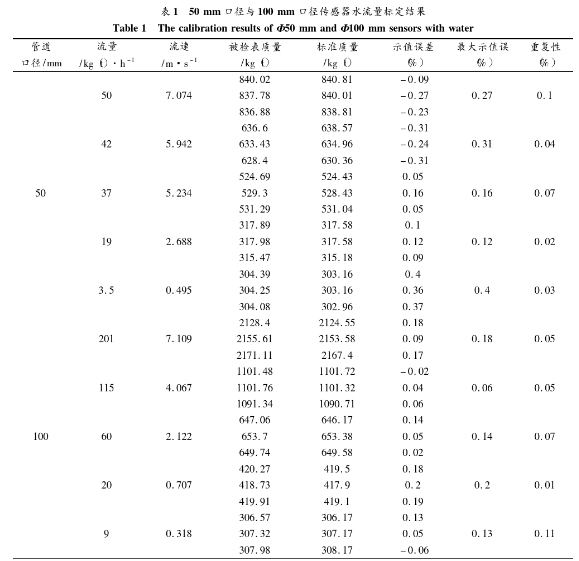 由標(biāo)定結(jié)果可知,所研制的化工污水流量計(jì)系統(tǒng)針對50mm口徑的水流量標(biāo)定示值誤差小于0.41%,重復(fù)性誤差小于0.11%。針對100mm口徑的水流量標(biāo)定示值誤差小于0.21%,重復(fù)性誤差小于0.12%。據(jù)此可知,所研制的化工污水流量計(jì)系統(tǒng)針對50mm與100mm口徑的水流量標(biāo)定精度均優(yōu)于0.5級。