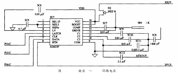 HT2012需要外部提供460.8kHz的時鐘信號,且要求時鐘頻率的誤差是0.1%,若直接入一個460.8kHz的晶振不僅會引起系統(tǒng)功耗的增加,而且該晶振屬于非標準晶振,需專門定制。為了解決這一問題,在系統(tǒng)中采用一片1.8432MHz的晶振以產(chǎn)生時鐘信號,再經(jīng)分頻器CD4013進行4分頗,可輸出1.8432MHz/4=460.8kHz的分頻信號供HT2012使用。AD421其內(nèi)部的電壓調(diào)節(jié)器與外部的場效應管DN25D對輸入到AD421的電壓進行調(diào)整,可提供+3.3V電壓作為其他設(shè)備的電源。HART發(fā)出的FSK信號,經(jīng)過一個電容耦合送到AD421中,轉(zhuǎn)換成相應的0.5mA正弦電流信號,實現(xiàn)電壓信號到電流信號的轉(zhuǎn)換,同時,疊加在4~20mA的電流上送給接收設(shè)備,實現(xiàn)了HART協(xié)議的信息的交換。本電路耦合電容取為0.0033μF,如圖5所示。