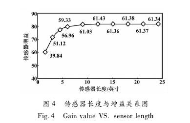 采用一臺(tái)日徑為6英寸、標(biāo)準(zhǔn)線圈的傳感器,改變傳感器長(zhǎng)度,依次進(jìn)行試驗(yàn)室標(biāo)定試驗(yàn)。傳感器長(zhǎng)度與增益的關(guān)系圖如圖4所示。當(dāng)傳感器長(zhǎng)度為9. 1英寸時(shí),其增益為61. 03;但當(dāng)其長(zhǎng)度繼續(xù)增加時(shí),增益變化較小;當(dāng)其長(zhǎng)度6. 1英寸減小到0時(shí),增益從59. 33開始下降。也就是說,當(dāng)傳感器長(zhǎng)度為6. 1-9. 1英寸時(shí),既有效利用了線圈產(chǎn)生的磁場(chǎng),又可使傳感器長(zhǎng)度較短。