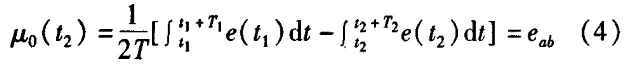 冷熱水流量計(jì)一般都采用工頻交流電源供電,其電源電壓的幅值和頻率的變化都會(huì)給冷熱水流量計(jì)帶來電源性干擾噪聲。對(duì)電源電壓的幅值變化,因采用多級(jí)集成穩(wěn)壓,一般而言電源電壓的幅值變化對(duì)電磁流量的測(cè)量精度影響不大。當(dāng)電源電壓的頻率波動(dòng)時(shí),雖然其波動(dòng)范圍有限,但對(duì)冷熱水流量計(jì)測(cè)量精度影響較大。為了解決工頻干擾問題,實(shí)現(xiàn)對(duì)流體流速感應(yīng)電勢(shì)e柚信號(hào)的準(zhǔn)確測(cè)量,需利用以下基本關(guān)系:①勵(lì)磁周期為工頻周期的整數(shù)倍,即勵(lì)磁頻率為50/nHz(n為偶數(shù));②正負(fù)勵(lì)磁下的同相位采樣。圖2是對(duì)應(yīng)低頻矩形波勵(lì)磁形式下的典型電勢(shì)信號(hào)形式,按上述關(guān)系在一個(gè)勵(lì)磁周期下,若假設(shè)t。和t:點(diǎn)為工頻干擾的等效干擾點(diǎn),且采樣寬度T=T1=T2,則e –ab的基本算式為:,
