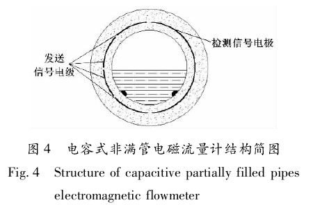 ②電容式非滿管污水廠出水用電磁流量計h。電容式非滿管污水廠出水用電磁流量計結構簡圖如圖4所示。、檢測信號電極 發(fā)送信號電