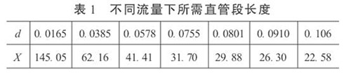 3.直管段長度和生物柴油流量計精度的初步預測在工程設計中,根據(jù)流體性質(zhì)、流量和雷諾數(shù)確定α和d值。這樣,按照式(5)就可以依不同的流量計精度要求,對直管段長度進行初步預測,或確定直管段長度后,對流量計的精度做初步預測。當δ= 0.2%時,不同流量下所需直管段長度見表1。