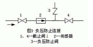 氟塑料襯里傳感器須謹慎地應用于負壓管系;正壓管系應防止產生負壓,例如液體溫度高于室溫的管系,關閉傳感器上下游截止閥停止運行后,流體冷卻收縮會形成負壓,應在傳感器附近裝負壓防止閥,如圖3所示。有制造廠規(guī)定PTFE 和PFA 塑料襯里應用于負壓管系的壓力可在200C、1000C、1300C時使用的絕對壓力必須分別大于27、40、50KPa。