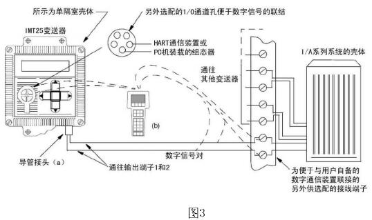 HART通信裝置或裝載在PC機上的組態(tài)器可以連接在變送器現場接線端到外部負載之間的任何位置,或連接到另外配供的1/0孔口上。如圖3所示: