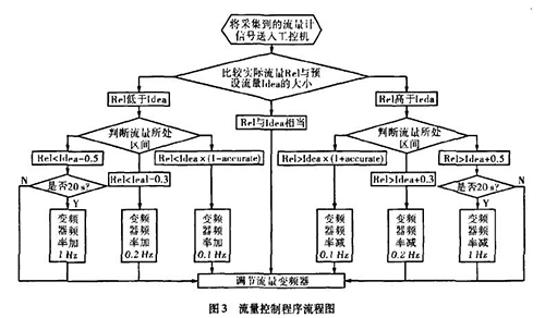 實(shí)際生產(chǎn)中流量一直在某個(gè)區(qū)域內(nèi)波動(dòng),且其動(dòng)態(tài)特性不易掌握。從上面的理論中我們能夠讓誤差△£盡可能的小,這樣距我們所需要的理論值%就越接近。而減小誤差需要我們把n取的盡可能大,也就是在生產(chǎn)時(shí)間內(nèi)劃分更多的周期去調(diào)節(jié)流量。當(dāng)工控機(jī)根據(jù)測(cè)模具水流量計(jì)傳送回來的信號(hào)發(fā)出調(diào)節(jié)變頻器工作頻率的指令后,電機(jī)調(diào)整功率到測(cè)模具水流量計(jì)的實(shí)際測(cè)量為一個(gè)工作周期,我們知道從指令發(fā)送到實(shí)際測(cè)量值返回有一個(gè)較大的滯后,如果調(diào)節(jié)的周期時(shí)間小于流量計(jì)本身的一個(gè)工作周期,那么顯然不可能達(dá)到減小誤差的目的。利用模糊控制思想H。,在控制程序中我們把流量的波動(dòng)區(qū)域劃分為±缸×Yo,Yo-t-O.3,Yo±0.5四個(gè)區(qū)域,其中缸為可調(diào)節(jié)的誤差范圍,生產(chǎn)中我們?nèi)?.015,流量區(qū)域劃分的單位均為t/h。針對(duì)不同的區(qū)域采取不同的調(diào)整方案。具體流程如圖3所示。圖中變量Rel表示實(shí)際測(cè)量的流量,變量Idea表示理論流量。