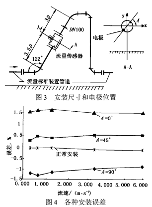 除儀表前直管段可降低彎管影響外,人們還從安裝方式上設(shè)法降低影響的方法。文獻(xiàn)曾報(bào)道電磁流量傳感器電極軸線與鄰近彎管平面成45°傾斜安裝可以減少彎管影響。日本工業(yè)標(biāo)準(zhǔn)B7554“解說部分”列有電極軸線與彎管平面垂直、平行、成45°三種安裝方式,在不同長(zhǎng)度直管下的測(cè)量誤差范圍,也說明這一效果。