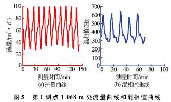 B2-××-××2井是大慶油田采油一廠1口水驅(qū)產(chǎn)出井,該井井口計量產(chǎn)液51.72m3/d,取樣化驗含水率81.8%。采用阻抗式含水率計在該井進行了測試,圖5為*1測點深度1068m測量的流量及混相值曲線圖。圖5的流量曲線表明,流量曲線受氣體影響較大,測量流量波動較大,在25~98m3/d之間波動,平均值為58.6m3/d;混相值波動也很大,在280~640Hz之間劇烈波動,平均值圖5*1測點1068m處流量曲線和混相值曲線388Hz。該井測量流量為65.8m3/d,測量含水為51.3%,受井下產(chǎn)氣影響明顯,測量流量明顯高于井口計量流量,測量含水率明顯低于化驗含水率。同時,在該井測井時,使用了儀器上裝有氣體分離器的阻抗式含水率計在該井進行測試,*1測點的流量及混相值曲線見圖6。由于氣體分離器將氣體分離,未進入測量通道,減小了氣體對測量傳感器的影響,測量的流量及混相值曲線波動明顯減少,流量波動為36~78m3/d,平均值為55m3/d;混相值波動為211~288Hz,平均值為228Hz。測量流量為54.8m3/d,測量含水率為80.4%,與井口計量非常接近。對比測量結果表明,氣體對流量及含水率測量造成了非常大的測量誤差,已不能進行準確測量。