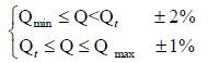 由圖2 可見(jiàn),儀表系數(shù)可分為二段,即線性段和非線性段。在非線性段, 實(shí)際特性受軸承摩擦力、流體粘性阻力影響較大。當(dāng)流量低于Qmin 時(shí),儀表系數(shù)隨著流量迅速變化。壓力損失與流量的平方成正比關(guān)系。通常線性段約為工作段的2/3,其特性與渦輪結(jié)構(gòu)參數(shù)及流體粘性有關(guān)。隨流量的變化其儀表系數(shù)K 也會(huì)有一定的變化,但變化不大,通常將其變化幅度稱為流量計(jì)的計(jì)量準(zhǔn)確度。對(duì)于產(chǎn)品設(shè)計(jì)而言,期望能將線性段的流量范圍拓展,一臺(tái)流量計(jì)能覆蓋同口徑的不同流量范圍,使得產(chǎn)品量程比變寬從而降低生產(chǎn)管理與生產(chǎn)批量加工成本。對(duì)于1.0 級(jí)的高壓機(jī)油流量計(jì),以Qt(0.2Qmax)為分界流量點(diǎn),將計(jì)量線性分為兩段,其中一段的*大允許誤差為±2%,而另一段的*大允許誤差為±1% 。按圖2 所示,通常每臺(tái)渦輪流量計(jì)均有較為相似特性曲線,若將可測(cè)量流量范圍做寬,就能在同口徑不同流量范圍進(jìn)行分段截取,以實(shí)現(xiàn)一臺(tái)流量計(jì)能覆蓋同口徑的不同流量范圍。