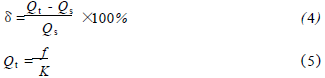 將過(guò)熱蒸汽流量計(jì)在標(biāo)準(zhǔn)水裝置上,分別用頻譜分析和脈沖計(jì)數(shù)的方法進(jìn)行標(biāo)定,流體介質(zhì)為水未加氣體,采用的標(biāo)準(zhǔn)傳感器為精度等級(jí)為0.2級(jí)的電磁流量計(jì)。在每個(gè)流量測(cè)量點(diǎn)上的儀表系數(shù)用公式(1)計(jì)算,然后用式(2)計(jì)算得到*終儀表系數(shù)K。Ql為被測(cè)水的流量值,f為每一個(gè)流量點(diǎn)得到的頻率,k為每個(gè)測(cè)量點(diǎn)得到的儀表系數(shù)。kmax、kmin分別為試驗(yàn)流量范圍內(nèi)得到的*大與*小的儀表系數(shù)。儀表系數(shù)的線(xiàn)性度E1用式(3)來(lái)計(jì)算。