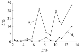 將試驗(yàn)數(shù)據(jù)進(jìn)行處理,得到了過(guò)熱蒸汽流量計(jì)測(cè)量誤差隨氣相含率變化的情況,如圖5所示。其中δs為譜分析方法的測(cè)量誤差,δc為脈沖計(jì)數(shù)方法的測(cè)量誤差。過(guò)熱蒸汽流量計(jì)的測(cè)量誤差用式(4)來(lái)計(jì)算。其中Qs為裝置中標(biāo)準(zhǔn)表測(cè)量出的管道總流量,Qt為試驗(yàn)管段中過(guò)熱蒸汽流量計(jì)的測(cè)量值。將譜分析和脈沖計(jì)數(shù)得到的頻率值和儀表系數(shù)分別代入式(5)計(jì)算Qt值。從圖中可以看出氣相含率的增加兩種測(cè)量方法得到的誤差并不相同。當(dāng)含氣率不高時(shí),0<β<6%,譜分析法的平均誤差為1.226%,*大誤差為2.687%,脈沖計(jì)數(shù)法的平均誤差為1.583%,*大誤差為2.898%,因此譜分析法與脈沖計(jì)數(shù)法的測(cè)量誤差區(qū)別不大,譜分析沒(méi)有明顯的優(yōu)勢(shì);在氣相含率進(jìn)一步增加時(shí),6%<β<14%,譜分析法的平均誤差為3.975%,*大誤差為14.058%,脈沖計(jì)數(shù)法的平均誤差為20.053%,*大誤差為33.130%,脈沖計(jì)數(shù)的方法得到的測(cè)量誤差遠(yuǎn)大于譜分析方法。