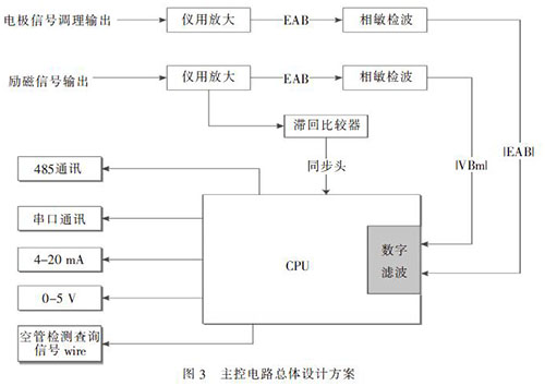電極檢測(cè)出的微弱感應(yīng)電動(dòng)勢(shì)E, 先經(jīng)前置放大器的放大和噪聲抑制而成為大幅度低阻抗的電壓信號(hào)。此信號(hào)經(jīng)相敏檢波后,給CPU 進(jìn)行數(shù)字濾波、處理和控制,通過(guò)利用雙線性變換法將模擬的二階巴特沃斯低通濾波器轉(zhuǎn)換為數(shù)字式濾波器,既簡(jiǎn)化電路設(shè)計(jì),且可靠性高、穩(wěn)定性好。通過(guò)編寫軟件CPU 能對(duì)放大器的溫度漂移及零點(diǎn)漂移給予補(bǔ)償, 并在測(cè)量的全量程范圍內(nèi)分10 段對(duì)信號(hào)進(jìn)行非線性修正,使得測(cè)量值更好地?cái)M合真實(shí)數(shù)據(jù)??展軝z測(cè)電路上,CPU 作為從控制器。當(dāng)主控制電路上發(fā)出空管檢測(cè)查詢信號(hào)wire, 從控制器進(jìn)行識(shí)別后接收并判斷出查詢什么信號(hào),然后產(chǎn)生應(yīng)答信號(hào)上傳至主控芯片輸出顯示;當(dāng)檢測(cè)為空管信號(hào)時(shí), 從CPU 發(fā)出的zero 信號(hào)通過(guò)控制MOS 管開關(guān)來(lái)關(guān)斷流速輸出。在應(yīng)用中,對(duì)于微弱信號(hào)的放大及提取還需注意PCB 板設(shè)計(jì)時(shí)EMI 電磁屏蔽考慮,屏蔽來(lái)自空間磁場(chǎng)的干擾、周邊設(shè)備的輻射造成的干擾和板內(nèi)之間的干擾,如數(shù)模分離、強(qiáng)弱電分離等等。