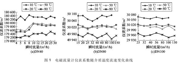 將實(shí)驗(yàn)測(cè)得的農(nóng)藥流量計(jì)在不同溫度及流速下的儀表系數(shù)數(shù)據(jù)整理,特性曲線如圖1所示,3組曲線分別對(duì)應(yīng)DN40、DN80、DN100的3塊農(nóng)藥流量計(jì)的儀表系數(shù)曲線。