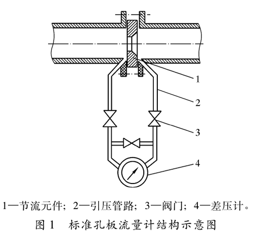 標(biāo)準(zhǔn)管道空氣流量計(jì)結(jié)構(gòu)如圖1所示,包括節(jié)流元件(標(biāo)準(zhǔn)孔板及其取壓裝置)、傳輸壓差信號(hào)的引壓管路、閥門以及差壓計(jì)等部分。標(biāo)準(zhǔn)孔板是壓差測量時(shí)的一次元件,人們利用它在管道內(nèi)使流體產(chǎn)生壓差,再通過引壓管路把孔板前、后產(chǎn)生的壓差傳送給差壓變送器,再輸人到二次儀表,從而顯示出管道內(nèi)流體的靜壓、壓差、瞬時(shí)流量和累計(jì)流量等計(jì)量參數(shù)。