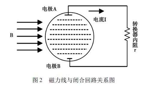 2. 1 正交干擾鹽水流量計的磁路系統(tǒng)包含有兩個勵磁線圈,而導(dǎo)管內(nèi)的液體與傳感器電極及轉(zhuǎn)換器結(jié)構(gòu)組成了一個閉合的回路,如圖2 所示。理論情況下,磁力線( 圖中B) 應(yīng)與閉合回路相平行,但是由于裝配過程中的誤差,導(dǎo)致磁力線不可能完全平行于這一閉合回路,出現(xiàn)部分磁力線成一定角度穿過回路的現(xiàn)象,這引起了即使沒有液體流動的情況下,傳感器的電極上也會產(chǎn)生感應(yīng)電動勢,就形成了正交干擾的基本形式。