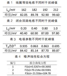 仿真試驗中,設(shè)定線圈等效電感取值范圍為 162~212mH,間隔 10mH;閉合回路等效電感范圍 0.2~1mH,間隔為 0.2mH;雙電層電容、接觸電阻隨流體電導(dǎo)率變化而變化,電導(dǎo)率增大接觸電阻和雙電層電容減小而電荷傳遞電阻增大??稍O(shè)定電極接觸電阻、雙電層電容和電荷傳遞電阻范圍分別為 5~15kΩ、10~20μF 和50~60Ω,由公式(7)知,可用 T2 表示上述三者關(guān)系。 仿真參數(shù)取值不同情況下,通過 MATLAB 工具箱對仿真測量得到的干擾峰值進行曲線擬合畫出相應(yīng)的曲線圖。 其中仿真數(shù)據(jù)和相對應(yīng)的曲線方程如表 1~表 4 所示,曲線圖如圖 4~圖 6。