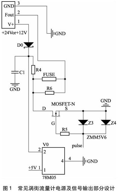從圖1 中可以看到,供電電源 +24 V, +12 V均可,直流電源通過瓷片電容 C1 濾掉部分紋波,然后通過線性穩(wěn)壓芯片 78M05,得到 + 5 V 電壓,為后面的氮氣流量計信號處理電路供電,若要再得到 3. 3 V 電壓,通常會在 78M05 后再加一片線性穩(wěn)壓芯片 LM1117-3. 3,為了節(jié)約成本,供電電路沒有做 EMS 設計。同時,脈沖輸出部分,僅通過一個 MOS 管和兩個穩(wěn)壓管,也沒有 EMS 方面的設計考慮。