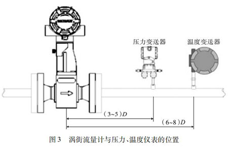 氮氣流量計的口徑如果與工藝管道相同,不能滿足流量儀表要求時,或者在此流速下測量準(zhǔn)確度不能保證時,需要縮小儀表口徑,從而提高管內(nèi)流速,保證測量精度。上下游必須有足夠的直管段,若傳感器安裝點的上游在同一平面上有 2 個 90°彎頭時,上游直管段≥25D,下游直管段≥5D。根據(jù)測量的需要,需在氮氣流量計附近測量壓力和溫度時,測壓點應(yīng)在傳感器下游的( 3 ~ 5) D 處,測溫點應(yīng)在傳感器下游的( 6 ~ 8) D 處,如圖 3 所示。