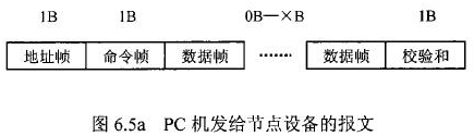 在分體式電磁流量計(jì)等節(jié)點(diǎn)設(shè)備和C機(jī)通信的過(guò)程中,由地址幀、命令幀、數(shù)據(jù)幀、校驗(yàn)和可組成各種功能不同的報(bào)文。由于采用主從工作方式來(lái)實(shí)現(xiàn)通信,分體式電磁流量計(jì)等節(jié)點(diǎn)設(shè)備僅能接收并執(zhí)行PC機(jī)發(fā)送來(lái)的控制命令,而不能發(fā)送命令給PC機(jī)。因此,由PC機(jī)發(fā)往流量計(jì)等節(jié)點(diǎn)設(shè)備的報(bào)文一般包括一個(gè)地址幀,一個(gè)命令幀,若干個(gè)數(shù)據(jù)幀和一個(gè)校驗(yàn)和,其報(bào)文格式圖.6a5所示;而由流量計(jì)等節(jié)點(diǎn)設(shè)備發(fā)往PC機(jī)的報(bào)文一般包括一個(gè)地址幀,若干個(gè)數(shù)據(jù)幀和一個(gè)校驗(yàn)和,其報(bào)文格式如圖6.5b所示。
