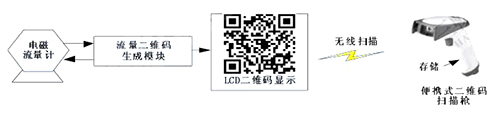 二維碼生成模塊定時(shí)向管道式電磁流量計(jì)發(fā)送采集指令,后者收到指令后發(fā)送流量數(shù)據(jù)。