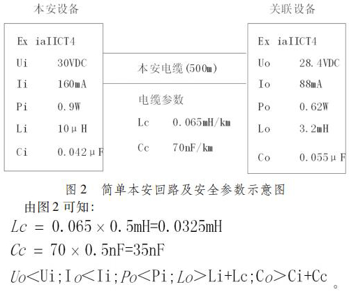 通過計(jì)算可知,本回路的安全參數(shù)均滿足不等式(1) ~ (5) ,因此本回路能通過本安回路計(jì)算,可以直接用于防爆區(qū)。