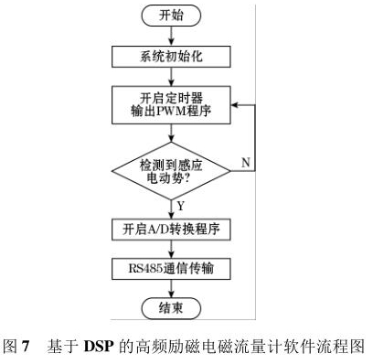 軟件流程圖如圖7 所示。軟件采用模塊化的設(shè)計(jì)方法,主要設(shè)計(jì)了勵磁控制切換程序、PWM 波產(chǎn)生程序、A/D 轉(zhuǎn)換程序以及 RS485 通信程序等。系統(tǒng)上電后*先執(zhí)行復(fù)位操作,利用 DSP 內(nèi)部的定時(shí)器產(chǎn)生PWM 波控制 H 橋電路中的勵磁方式,當(dāng)系統(tǒng)檢測到傳感器線圈輸出的感應(yīng)電動勢后,利用 DSP 內(nèi)部的 12位 A/D 轉(zhuǎn)換器對此信號進(jìn)行模數(shù)轉(zhuǎn)換,*后根據(jù)相應(yīng)算法計(jì)算出管道中被測液體的流量。