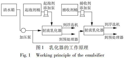 選煤廠浮選藥劑乳化裝置是將藥劑和水制成乳化液,實(shí)現(xiàn)藥劑的合理使用,將對浮選效果和節(jié)約藥劑起到一定的作用。在使用中可根據(jù)藥劑和水的配制比例觀察藥劑的乳化效果,通過乳化器操作箱內(nèi)的的電位器調(diào)整水泵轉(zhuǎn)速,即調(diào)整乳化壓力。自動(dòng)加藥控制是根據(jù)入浮流量與入浮濃度的檢測結(jié)果,控制起泡劑與捕收劑的加入。乳化器的工作原理如圖 1 所示。