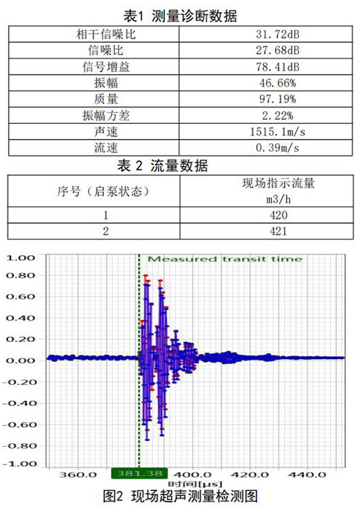 在高負(fù)荷段采用泵送補(bǔ)給水狀態(tài):測試時間 2018年10月11日,采用德國FLUEX高精度外夾式超 聲波流量計作為標(biāo)準(zhǔn)流量計,測量基礎(chǔ)數(shù)據(jù):管道 外徑276.93mm,管壁厚度12.40mm,采用兩聲程169mm傳感器安裝距離,通過對超聲波流量計信號 分析與診斷(數(shù)據(jù)見表1、表2和圖2),診斷數(shù)據(jù) 提示標(biāo)準(zhǔn)超聲波流量計測量狀況佳,檢測開始,啟 動補(bǔ)給水泵,運(yùn)行一段時間流量穩(wěn)定后,測量結(jié)果 如下: