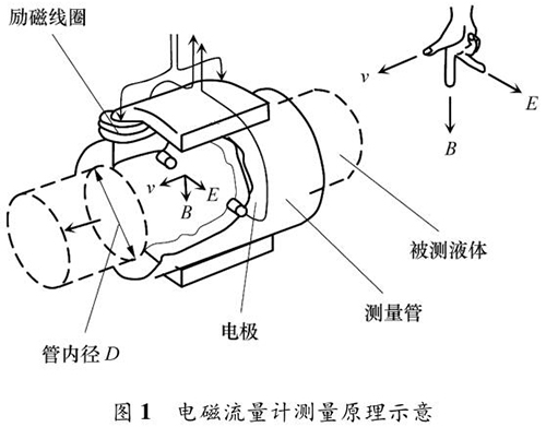 乙醇管道流量計(jì)的測量原理如圖 1 所示。根據(jù)法拉*電磁感應(yīng)定律,導(dǎo)電液體在磁場中流動(dòng)會(huì)產(chǎn)生電動(dòng)勢 E,它與磁感應(yīng)強(qiáng)度 B、導(dǎo)電液體平均流速 v 成一定比例關(guān)系:
