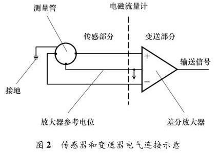 乙醇管道流量計(jì)主要由兩部分組成:流量傳感器和信號(hào)變送器,如圖 2 所示。傳感器上的勵(lì)磁線圈接受變送器傳輸來的勵(lì)磁電流產(chǎn)生磁場,輸出感應(yīng)電動(dòng)勢信號(hào);信號(hào)變送器則將感應(yīng)電動(dòng)勢信號(hào)轉(zhuǎn)換為流量信號(hào)或模擬量信號(hào)送至控制系統(tǒng)。乙醇管道流量計(jì)按組成方式分為一體式和分體式。乙醇管道流量計(jì)穩(wěn)定工作另外一個(gè)重要條件是接地。當(dāng)流體流動(dòng)穿過磁場時(shí),以導(dǎo)電流體本身作為參考電位,在測量管一側(cè)電極產(chǎn)生正電勢,另一側(cè)產(chǎn)生負(fù)電勢,形成電勢差。但此電動(dòng)勢信號(hào)一般只有幾毫伏,易受外界干擾。為防止干擾,將參考電位接入大地作為零電位,保證傳感器輸出精確穩(wěn)定的信號(hào)。傳感器和轉(zhuǎn)換器的接地端必須與被測介質(zhì)同電位,才能構(gòu)成對稱的輸入輸出回路。