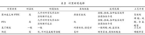 乙醇管道流量計(jì)要根據(jù)被測流體的溫度、壓力、速度以及含固顆粒的硬度、含量和粒徑大小來決定測量管內(nèi)襯的材質(zhì)。該濕法磷酸裝置中,乙醇管道流量計(jì)測量管襯里材質(zhì)的種類見表 2。