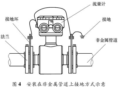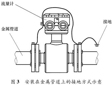 乙醇管道流量計(jì)安裝在金屬管道上,安裝時(shí)將金屬管道與乙醇管道流量計(jì)相連接,接地線再接入接地網(wǎng),如圖 3 所示。