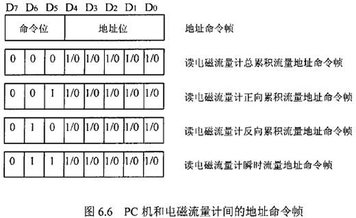 由于RS一485電氣標(biāo)準(zhǔn)規(guī)定每段只能聯(lián)結(jié)犯?jìng)€(gè)節(jié)點(diǎn)設(shè)備,因此可用地址幀中五個(gè)二進(jìn)制位表示這32個(gè)地址,其余3位用來(lái)表示命令,從而構(gòu)成地址命令幀。對(duì)于控制命令需求不超過(guò)八個(gè)的通信系統(tǒng),采用地址命令幀可壓縮報(bào)文長(zhǎng)度提高通信效率。在污水網(wǎng)絡(luò)監(jiān)控系統(tǒng)中,插入式電磁流量計(jì)和PC機(jī)通信的主要目的是將流量計(jì)中的有用數(shù)據(jù)讀到PC機(jī)中。這些數(shù)據(jù)包括:總累積流量、正向累積流量、反向累積流量、瞬時(shí)流量。通信時(shí),PC機(jī)只需向插入式電磁流量計(jì)發(fā)送讀總累積流量、讀正向累積流量、讀反向累積流量、讀瞬時(shí)流量命令即可,因此二者間通信所用的地址幀和命令幀可合二為一,用一個(gè)地址命令幀代替。PC機(jī)和插入式電磁流量計(jì)間的地址命令幀定義如圖.66所示。根據(jù)污水網(wǎng)絡(luò)監(jiān)控系統(tǒng)中PC機(jī)與插入式電磁流量計(jì)間通信的特殊性,二者通信所使用的報(bào)文可簡(jiǎn)化為圖.67的格式。