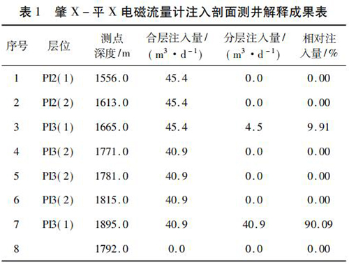 2017 年 9 月在大慶油田采油八廠肇 X - 平 X 水平井注水井中*次進(jìn)行了水平井注入剖面測井現(xiàn)場試驗(yàn)。該井斜深2 055. 42 m,水平段長度為568. 46 m,試驗(yàn)?zāi)康氖峭ㄟ^注入剖面測井了解該井各層段的注水情況,同時對水平井測井工藝、儀器的適用性、井下牽引器及井口輔助裝置等設(shè)備的工作有效性和可靠性進(jìn)行評價(jià)?,F(xiàn)場試驗(yàn)中,在密閉條件下錄取到了該井的注入剖面測井資料,進(jìn)行了重復(fù)測量,重復(fù)測量結(jié)果在誤差允許范圍內(nèi),測井成果見表 1。該井施工壓力 6. 0 MPa,注入量45. 4 m3 /d,有 7 個射孔層,分 8 個測點(diǎn)測量,2 個層有吸入顯示,其中,P13( 1) ( 1 734 ~ 1 767 m) 層絕對吸入量4. 5 m3 /d,相對吸入量為9. 91 %,P13( 1) ( 1 899 ~1 943 m)層絕對吸入量 40. 9 m3 /d,相對吸入量為 90. 09% ,測井成果見表 1。通過與甲方的交流,再結(jié)合該井的動靜態(tài)資料及周圍井的工作狀況,采油廠的地質(zhì)人員認(rèn)為本次測井結(jié)果能比較準(zhǔn)確地反映該井的注入情況。