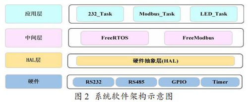 Modbus 通訊模塊的軟件架構(gòu)如圖 2 所示,分為硬件層、硬件抽象層,中間層和應(yīng)用層。中間層包括一個(gè)實(shí)時(shí)操作系統(tǒng)FreeRTOS 和一個(gè)針對(duì)嵌入式環(huán)境開(kāi)發(fā)的輕量級(jí) Modbus 協(xié)議庫(kù)Freemodbus。在應(yīng)用層,主要?jiǎng)?chuàng)建了三個(gè)任務(wù),232_Task 負(fù)責(zé)讀 取和解析流量計(jì)表頭輸出的文本信息,Modbus_Task 負(fù)責(zé)存儲(chǔ) 解析后的流量計(jì)數(shù)據(jù)到 Modbus 寄存器表,以及以 Modbus 協(xié)議與取水監(jiān)測(cè)設(shè)備通信,LED_Task 是一個(gè)輔助任務(wù),主要用來(lái)提示程序運(yùn)行狀態(tài)。
