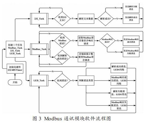 圖 3 為 Modbus 通訊模塊的軟件流程圖,創(chuàng)建的三個(gè)任務(wù)都是以 FreeRTOS 系統(tǒng)的消息(Message)來(lái)驅(qū)動(dòng)。