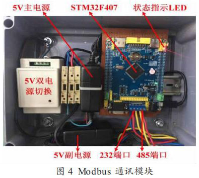 Modbus 通訊模塊如圖 4 所示。為保證供電穩(wěn)定,使用了電源切換裝置給主板供電,共有主副兩路 5V 電源。