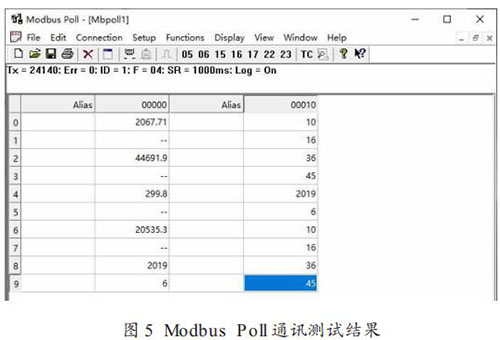 Modbus Poll 通訊測(cè)試結(jié)果如圖 5 所示:Tx = 24140,Err =0,ID = 1,F(xiàn) = 04,SR = 1000ms,Log = on。 其中 ,Tx 為Modbus Poll 發(fā)送命令次數(shù),也就是說(shuō)在測(cè)試期間 Modbus Poll軟件共發(fā)送讀輸入寄存器命令 24140 次(發(fā)送間隔為 1s,測(cè)試時(shí)間為 6.7 小時(shí));Err 為通訊錯(cuò)誤數(shù),Err = 0 表明 Modbus 通訊模塊正確響應(yīng)次數(shù)為 24140 次(錯(cuò)誤數(shù)為 0)。
