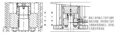 4)優(yōu)化閥桿與閥座的對中性,由于原設(shè)計(jì)結(jié)構(gòu),閥桿與閥座的對中性不易保證,此次加工新導(dǎo)向十字套減小了套環(huán)與閥桿的配合間隙,同時增加套環(huán)與操縱座套筒的配合,優(yōu)化后的導(dǎo)向十字套結(jié)構(gòu)自身能夠保證閥桿的定位及對中,如圖3。