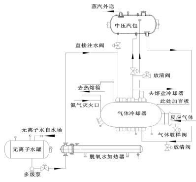 來自無離子水罐的脫氧水經多經泵加壓、經脫氧水加熱器加熱后進入到智能型渦街流量計的水段,脫氧水與反應氣體換熱后分兩路:一路進入中壓汽包,保證汽包有穩(wěn)定的液位;一路進入熔鹽冷卻器帶出熔鹽攜帶的反應熱。來自中壓汽包的高溫水經管路接至智能型渦街流量計汽段底部,高溫水與反應氣體換熱后產生高壓蒸汽,高壓蒸汽又返回中壓汽包。汽包還有一路直接注水管路,此路水不經過智能型渦街流量計水段,而是直接進入汽包。在智能型渦街流量計出口溫度偏低而汽包液位也比較低時,可開此直接注水管路來穩(wěn)定汽包液位。其詳細流程圖如圖 2。