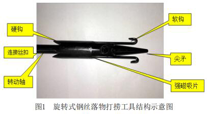 (1)一體式渦街流量計結構設計合理,旋轉機構實現(xiàn)了井下鋼絲在鉤身上的纏繞,軟硬鉤配合設計實現(xiàn)鋼絲的多角度打撈,強磁片的設計實現(xiàn)了小物件落物的一次性打撈,也防止了短小鋼絲落物的再次出現(xiàn)。