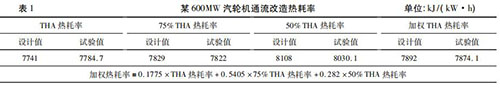 隨著火電機(jī)組利用小時(shí)數(shù)降低,發(fā)電企業(yè)一般都會(huì)根據(jù)不同負(fù)荷工況下的實(shí)際運(yùn)行小時(shí)數(shù),確定機(jī)組熱耗率考核權(quán)重,形成*終的加權(quán)熱耗率考核值??己思訖?quán)熱耗率對(duì)設(shè)備廠家末級(jí)葉片選型、高壓調(diào)門與高壓缸匹配性提出了更高的要求,在當(dāng)前負(fù)荷率偏低的情況下增強(qiáng)了發(fā)電企業(yè)的競(jìng)爭(zhēng)力。然而,僅僅對(duì)加權(quán)熱耗率進(jìn)行考核是不夠的,設(shè)備廠家為了增強(qiáng)自身的競(jìng)爭(zhēng)力,往往會(huì)把全部重點(diǎn)放在如何降低占比大的低負(fù)荷熱耗率上而犧牲高負(fù)荷的熱耗率,這無(wú)疑削弱了發(fā)電企業(yè)的適應(yīng)性。某廠一臺(tái) 600MW 汽輪機(jī)通流改造時(shí)僅對(duì)加權(quán)熱耗率進(jìn)行考核,THA 熱耗率要高出設(shè)計(jì)值43. 7 kJ/( kW·h) ,詳見(jiàn)表 1。通流改造時(shí)既要對(duì)加權(quán)熱耗率進(jìn)行考核,也要對(duì) THA工況時(shí)熱耗率進(jìn)行考核。
