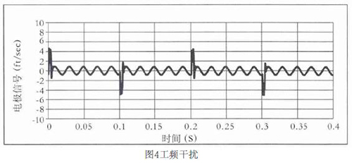 工頻干擾是硫酸管道流量計常見的干擾源。當(dāng)流量計處于電源形成電磁場中時,由于分布電容的存在,以電磁波的輻射形式干擾電極信號,或者是由供電電源引入的工頻串?dāng)_,工作現(xiàn)場的工頻共模干擾,其產(chǎn)生的物理機(jī)理均是電磁感應(yīng)原理。幅度與流量信號相比,往往要大幾個數(shù)量級,頻率與供電電源頻率相同。如圖4所示,線圈驅(qū)動頻率為5Hz的電極信號,被耦合了50Hz的工頻干擾,幅度大概相當(dāng)于1feet/s。