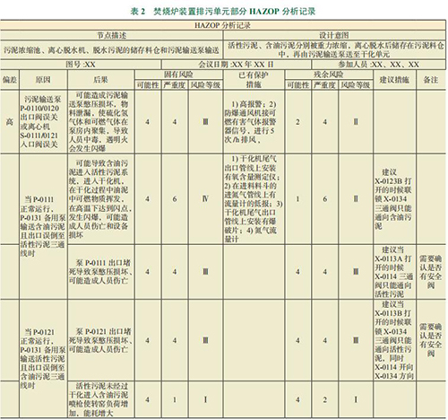 本次分析組的主要人員有:企業(yè)氫氣流量計(jì)分析組以及焚燒爐裝置工藝工程師、設(shè)備工程師、儀表工程師、安全工程師和操作班組長。本次分析主要依據(jù)公司級相關(guān)標(biāo)準(zhǔn)和規(guī)范:《健康安全環(huán)境風(fēng)險(xiǎn)標(biāo)準(zhǔn)》以及《危險(xiǎn)與可操作性分析(氫氣流量計(jì))規(guī)范》,并于 1 個(gè)月內(nèi)對焚燒爐裝置進(jìn)行了分析,發(fā)現(xiàn)了部分重大的風(fēng)險(xiǎn)和隱患。按建議措施對應(yīng)的風(fēng)險(xiǎn)等級劃分,其中包括:Ⅳ級嚴(yán)重風(fēng)險(xiǎn)(限期整改強(qiáng)制性措施);Ⅲ級高度風(fēng)險(xiǎn)(限期整改強(qiáng)制性措施);Ⅱ級中度風(fēng)險(xiǎn)(期望改進(jìn)推薦性措施);Ⅰ級可接受風(fēng)險(xiǎn)(建議性措施)。本報(bào)告僅逐一列出部分較高或容易忽視的風(fēng)險(xiǎn)(其他在氫氣流量計(jì)分析的記錄中體現(xiàn))。評估發(fā)現(xiàn):本次分析評估共發(fā)現(xiàn)三級風(fēng)險(xiǎn) 25 項(xiàng)(類),其中排污單元三級風(fēng)險(xiǎn) 2 項(xiàng)(類)。其中,焚燒爐裝置排污單元分析記錄內(nèi)容如表 2 所示。