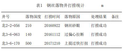 表1為氣體轉(zhuǎn)子流量計打撈統(tǒng)計表,可以看出自2016年9月開始即在現(xiàn)場進行了應(yīng)用。為了展示試驗成果的普遍性,分別從不同注入方式、不同落物深度、不同落物原因的角度,共應(yīng)用3口鋼絲落物井,打撈成功為100%。