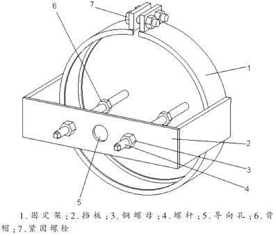 固定架是以金屬板料為主體加工而成的半開環(huán),環(huán)開口處設(shè)置緊固螺栓,環(huán)內(nèi)外均設(shè)置卡環(huán)。擋板是由一定厚度的金屬板加工而成的U形構(gòu)件,焊接于固定環(huán)兩側(cè),擋板中間設(shè)置了一個(gè)導(dǎo)向孔,導(dǎo)向孔兩側(cè)各有一個(gè)安裝銅螺母的通孔。螺桿由較高強(qiáng)度的金屬棒料加工而成,其一端螺紋與閥蓋螺孔的螺紋一致,用于連接閥蓋上的螺孔,并設(shè)有背帽防止螺桿脫離閥蓋;中段及另一端的螺紋均為梯形螺紋,與銅螺母的螺紋一致。