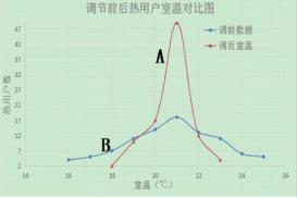 我公司在該小區(qū)管網(wǎng)改造前,在不同單元不同樓層分別安裝100臺室溫采集器。渦街流量計調(diào)前數(shù)據(jù)采集于2017~2018年供熱期,調(diào)后數(shù)據(jù)采集于2018~2019年供熱期。經(jīng)過兩個采暖期,共有96臺室溫采集器可以正常提供數(shù)據(jù)。數(shù)據(jù)分析結(jié)果見圖3所示。