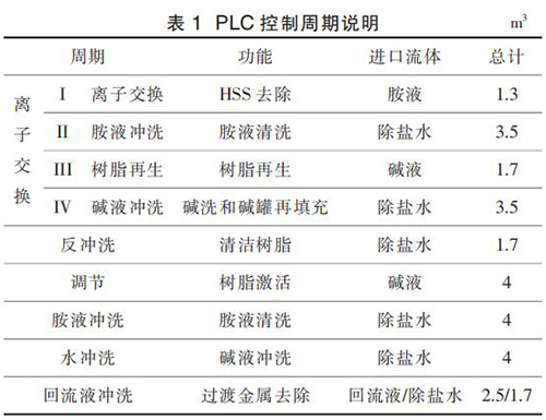 APU 的運(yùn)行按照事先設(shè)定的程序運(yùn)行,即嚴(yán)格遵循設(shè)定的步驟順序。 APU 的正確運(yùn)行依賴于每個(gè)步驟的順利完成。 按照預(yù)先設(shè)定好的步驟完成 1 個(gè)任務(wù)即視為完成 1 個(gè) APU 運(yùn)行的“周期”。 離子交換的主周期被稱(chēng)為“離子交換周期”。除此之外,整個(gè)控制程序還包含另外 5 個(gè)輔助周期, 分別為反沖洗周期、調(diào)節(jié)周期、胺液沖洗周期、水沖洗周期、回流液沖洗周期。 這 5 個(gè)周期在維護(hù)和非計(jì)劃停車(chē)后重新啟動(dòng)時(shí)使用。 PLC 控制各個(gè)周期的說(shuō)明見(jiàn)表 1。