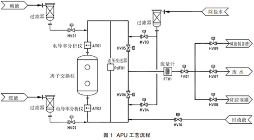 整個(gè) APU 都是通過(guò) PLC 程序自動(dòng)控制的。程序通過(guò)控制閥門(mén)的開(kāi)關(guān)使不同的液體按順序進(jìn)入離子交換柱,使離子交換柱中的液體按順序排出。