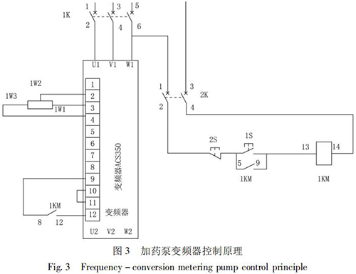 STD - Ⅲ型浮選工藝參數(shù)自動測控系統(tǒng)通過雙膜盒差壓計(jì)測量原礦漿濃度; 采用工業(yè)水流量計(jì)測量原礦漿流量,由 PLC 計(jì)算出入浮干煤泥量和藥劑的瞬時添加量,用變頻式計(jì)量泵完成浮選藥劑的添加。通過上位機(jī)還可以打印小時、班、天及月的運(yùn)行數(shù)據(jù),更加有利于生產(chǎn)管理及技術(shù)分析,藥劑自動原理如圖 2 所示,k1、k2、k3 是計(jì)算修正參數(shù)。以 PID 算法為核心,通過優(yōu)化控制程序計(jì)算出藥劑給定量,在捕收劑和起泡劑管道上分別安裝藥劑測量裝置,用于檢測藥劑的添加量。當(dāng)藥劑測量值小于藥劑給定量時,PID 輸出增大,反之則減小。加藥泵變頻器控制原理如圖 3 所示。